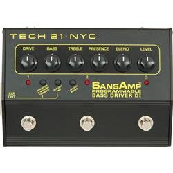 Sans Amp Programmable Bass Driver DI Much more than just a direct box, the SansAmp Bass Driver DI is capable of dialing up big vintage tube tones, bright modern slap sounds, gnarly distortions, and all in between. Three different outputs to drive power amps, recording desks, PA mixers, or simply enhance your current rig. Controls include Presence for definition and upper harmonic content; Blend to combine the proportion of direct signal and SansAmp circuitry; and active EQ specifically tuned for bass with 12dB of cut or boost. The controls offer a broad range of traditional bass amp sounds, including such meaty styles as Bassman and SVT, as well as raunchy, crunchy overdriven sounds that would typically require a multitude of effects units. For studio and live applications, SansAmp Bass Driver DI is engineered with three outputs: an effected XLR, and effected 1/4", and a parallel, unaffected 1/4". The footswitch activates the Tube Amplifier Emulation circuitry. Disengaging the circuitry enables you to use SansAmp Bass Driver DI as a standard active transparent direct box.